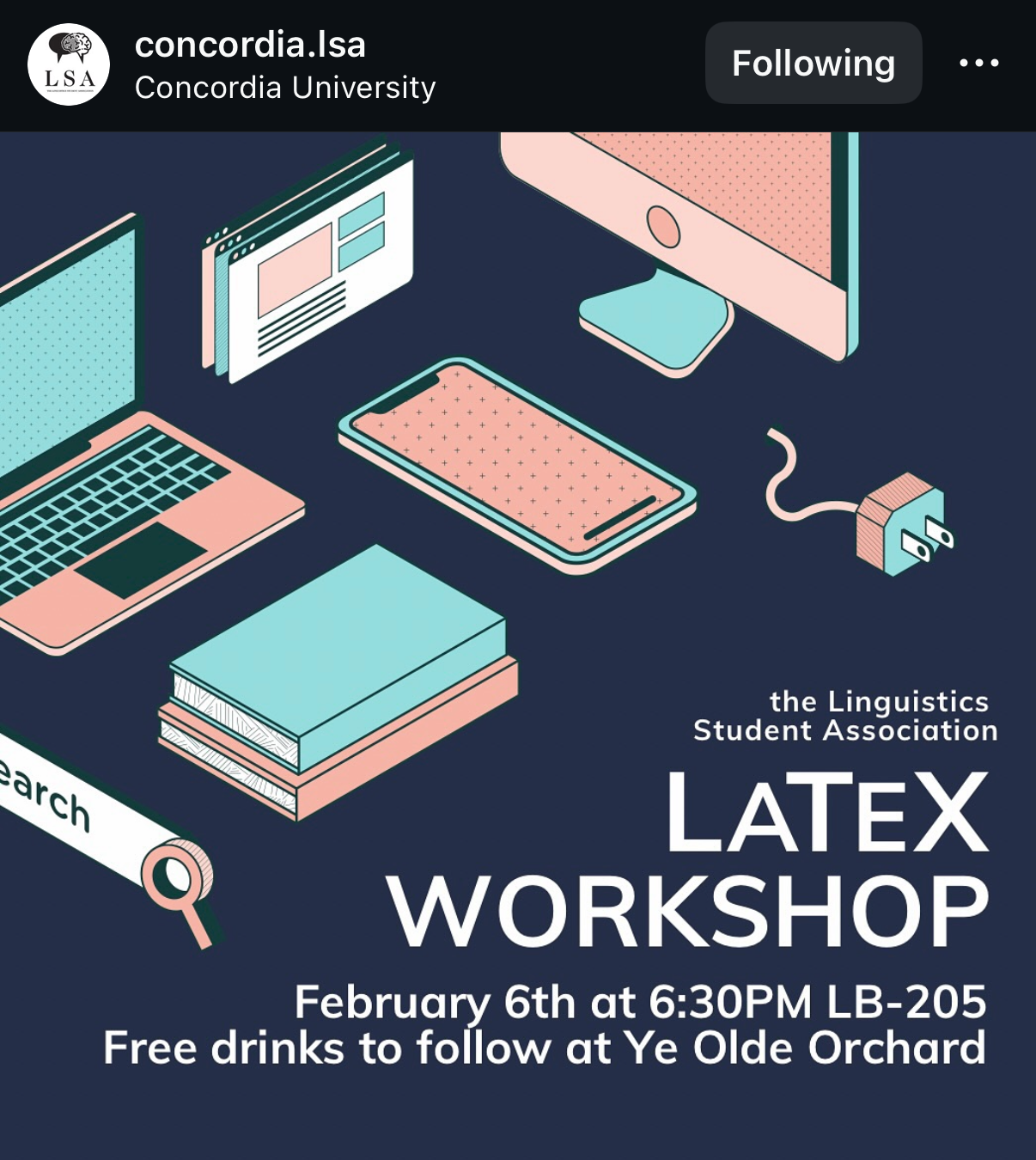 Also, check out this workshop I did for the Linguistics Student Association at Concordia University. It was an introductory LaTeX workshop. Maybe I'll link the power-point presentation I made one day.